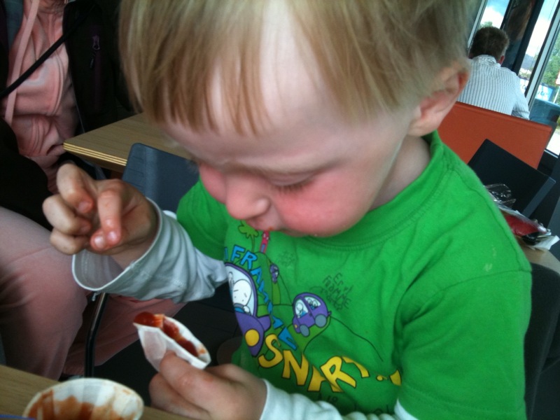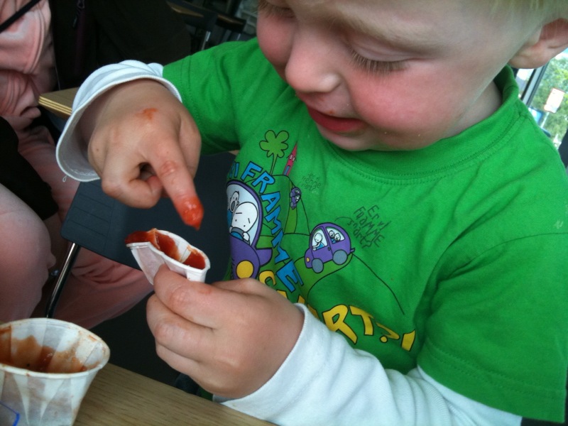 Tror ikke jeg skal bruke for mange setninger på matopplevelsen, men kosen og gleden skal få litt plass. Museflettene fikk det de sjeldent får og en litt sliten pappa kunne betale, spise og dra hjem til sofaen. En artig sak som jeg opplever hver gang vi dropper inn på vår lokale Bergby`s er folks unnskyldninger og bortforklaringer; «Vi pleier ikke å være her altså, ungene skal på trening så vi rakk ikke å lage noe hjemme»…Jeg fikk til og med en kommentar fra en navnbror i køen i dag; «spiser du her da…trodde du var hjemme og blogga om det du lagde jeg»…den satt som ei tett badehette. Og jommen om jeg ikke startet på en bortforklaring, men heldigvis tok jeg meg i det, kastet håndkle og innrømmet at det frista med «fett» i dag. Takk til «Taxi-Lars» for sparket bak, den var fortjent! En annen kar vi traff var nabogutten «O». Han stabba bort til bordet og spiste litt av museflettenes Ketchup, mens moren handlet inn.