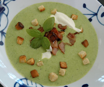 Ha suppen i dype (gjerne varme) tallerkner, strø på bacon, croutoner og litt pisket rømme – rømme og croutoner vil ikke fruen ha – gjett hvorfor, hehe. Jeg liker at det er litt tekstur (som kokkene sier) i retten, at det knaser litt selv når jeg spiser suppe. Derfor croutoner.