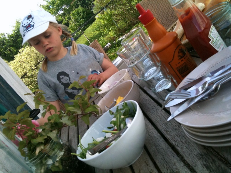 Det tok ikke lenge før grillen var varm, pølsene svidd av, salat og tilbehør på bordet. Parallelt forsvant arbeidsantrekkene til fordel for skjorts og BH. Jeg elsker sommerdager!