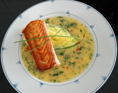 På mange måter er dette en «fet» rett på mange måter. Laksen er en feit fisk, kålen får en del smør og Beurre blanc er jo enkelt å greit løk, vin og «mengder» usaltet smør – med andre ord en smørsaus.