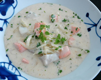 I huset vårt liker vi suppe! Suppe serveres sjeldent når vi har gjester og god tid, men i hverdagen kommer det suppe på bordet titt & ofte. I går kveld gikk jeg gjennom kjøleskap og fryser for å se om det var råvarer der som burde ende i gryta snart – og det var mye forskjellig. Det viktigste jeg fant var en salmalaks i fryseren. Den byttet plass over fra fryser til kjøleskap så den skulle bli for dagens middagsbord.