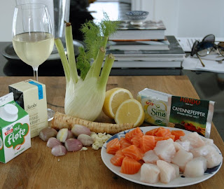 Derfor er det viktig å basere suppa på en fiskekraft. Skulle man gjort dette etter boka – og det har man jo ikke tid eller ork til kl 1715 på en mandag, da bruker man ferdig kraft. Enten fiskebuljong-terning eller litt mer fancy ferdig kraft fra en produsent. Jeg brukte fiskekraften fra Jacob`s. Den er god, men litt dyr.