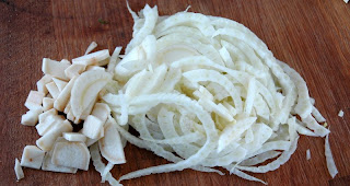 Kutt så fennikelen i skiver som en løk. Finkutt sjalottløk og hvitløk. Kutt selleriroten i skiver.