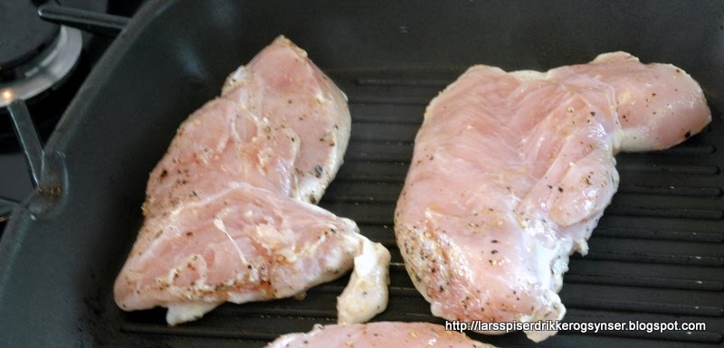 Stek kyllingfiletene i en grillpanne. Salt kyllingen i panna. Skjær filetene så opp på langs, bitene bør være ca 1,5 sm tykke.