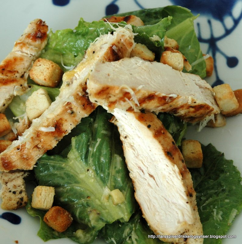 Det geniale med en Ceasar Salat er at den kan bygges ut. Med det mener jeg at salaten-delen av retten kun er å regne for en base. Så kan man putte på det man måtte ønske av godsaker. En plain Ceasar Salat er i grunnen romanosalat og croutoner med en god dressing, bestående av hvitløk, sitron, Worcestershire sauce, olivenolje, rødvinseddik, parmesanost, kapers, eggeplommer og ansjos. I tillegg velger jeg i dag å servere med kyllingfilet. Da får man økt comfort-food graden, det er fremdeles sunt og Fruevennlig.