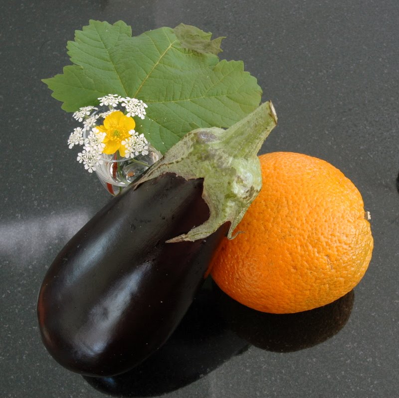 Legg auberginkompott og kjøtt opp på tallerken. Ha litt sitronolje rundt det hele, ca 1 ss per tallerk. Ha urtesmør på kjøttet. Dette er mat som hadde fortjent vin, men Fruen skulle trene og jeg må ut på biltur senere så vinen i dag får bli et glass rose utpå kvelden.