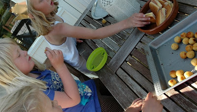 Dette er jo ikke akkurat museflettemat. Dessuten er det umulig å få musefletten til bordet når det er sommer i lufta. Derfor ble det en liten buffet på det som skal bli terrasse.Ryktet spredte seg raskt i museflettekretsene, og vips var det en gjeng – sweet!