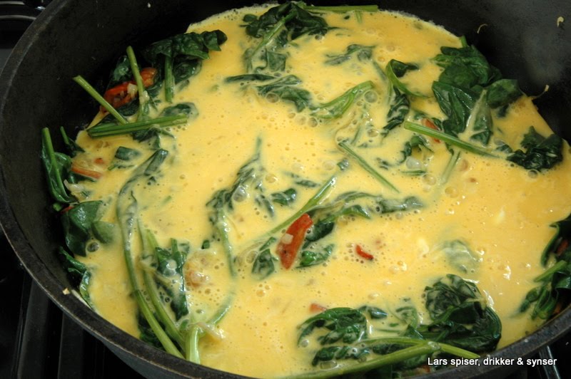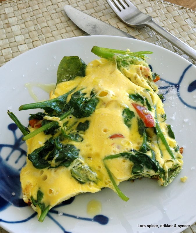 Jeg er ikke typa som tar meg en brødskive. Skal jeg først spise vil jeg kose meg. Ikke at brød må være kjedelig, men det er ikke slik at vi alltid har fersk brød og en godt modnet Jarlsberg på kjøkkenet. Derfor liker jeg å slenge sammen noe enkelt som gir meg følelsen av å spise ordentlig. Fruen har nettopp kommet hjem fra trening og vil ha proteiner så jeg benytter anledningen til å glede oss begge med en omelett.