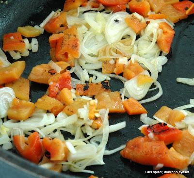Pisk sammen egg og rømme. Sauter sjalottløk & hvitløk. Ha i paprikaen – jeg bruker den ferdig grillede som man får i glass.