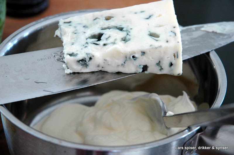 Gjør som følger; 3 ss creme fraish i ei lita gryte, 1 ss kalvebuljong og 100g Gorgonzola ost. Jeg bruker Gorgonzola Inteno. Andre blåmuggoster funker også. Det eneste jeg ikke har likt så godt i denne sausen er Gorgonzola picante – det ble for «sterkt». Ikke salt denne sausen før du har smakt. Ost og buljong har mest trolig salt nok i seg.