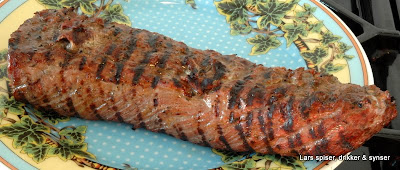 Kjøttet grilles på alle sider på direkte varme for å få stekeskorpe. Så over på den «kalde» siden av grillen, på med lokket og la den steke seg ferdig, ca 8-10 minutter. La kjøttet hvile i ca 10 minutter før du kutter i det. Det som er viktig er at du ikke pakker inn kjøttet. Da vil stekingen fortsette og kjøttet blir grått. Du vil ha en rosa kjerne!