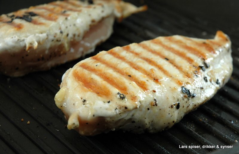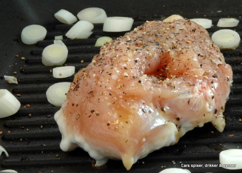 Kyllingfiletene og vårløken ble stekt i grillpanne med litt olje, salt & sort pepper.