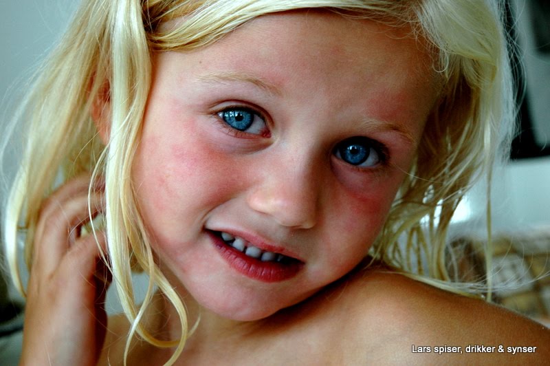 Ungen hadde vabler i hele ansiktet og på armene. Hun lignet ikke lenger på min datter. Jeg stilte noen kontroll spørsmål; Hva har du spist? Har du vært i hagen og plukket ugress? Har du…PØLSA. Klart det er Pølsa.