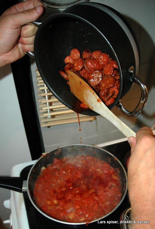 Kvelden ble kronet med Champagne, vin og en klassiker – chorizo-pasta (link til oppskrift)