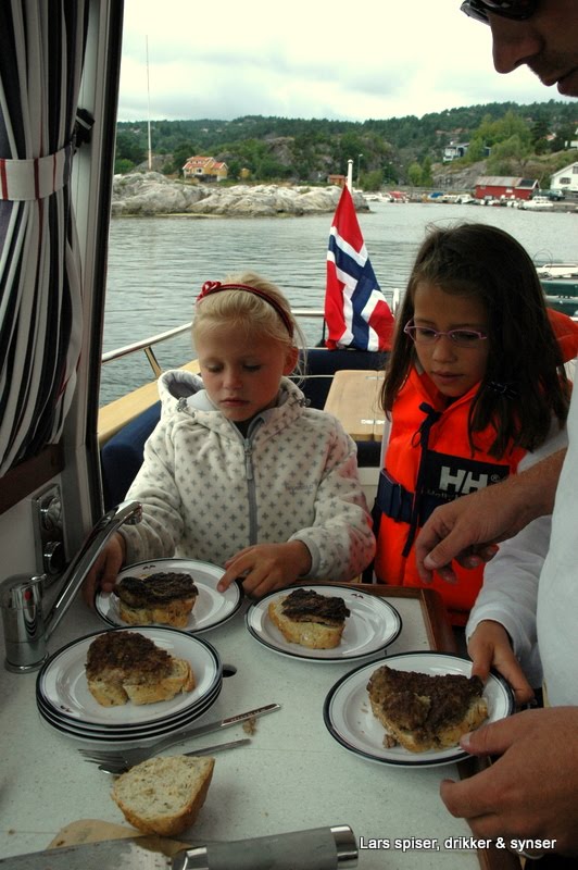 Maten var boller, kjeks, fersk brød med karbonader, vannmelon og sjokomelk – alt en museflette begjærer! På båten er jeg utnevnt til styrmann, fokkeslask og stuert – et herlig liv!