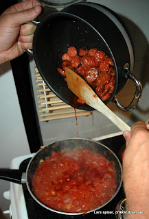Her kommer godsakenen fra pølsene ned i sausen – et must!