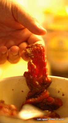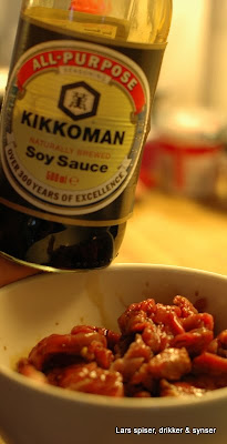 Bland sammen 4 ss soyasaus, litt sitronsaft, sort pepper og rød tørket chillie (så mye du tæler). Bland kjøttet i marinaden, rør rundt noen ganger – fint å marinere kjøttet et par timer før det skal på pizzaen. Super godt sammen med sorte oliven og litt gorgonzola. Ikke ha salt i marinaden – dette blir salt nok!
