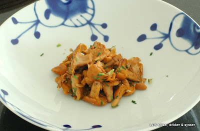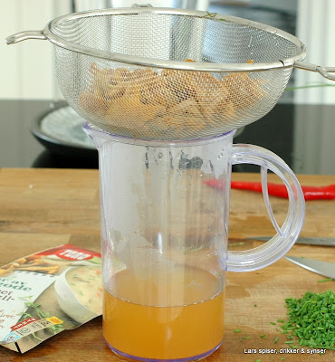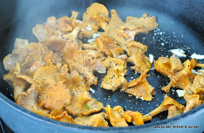 Kantarellene var forvellet og frosset ned. Lars tinte posen i litt varmt vann. Hadde soppen i en sil og brukte soppkraften i stedet for vann som anvist på suppeposen. Det gav suppe en ekstra dybde og smak – sweet taste of SKOG!