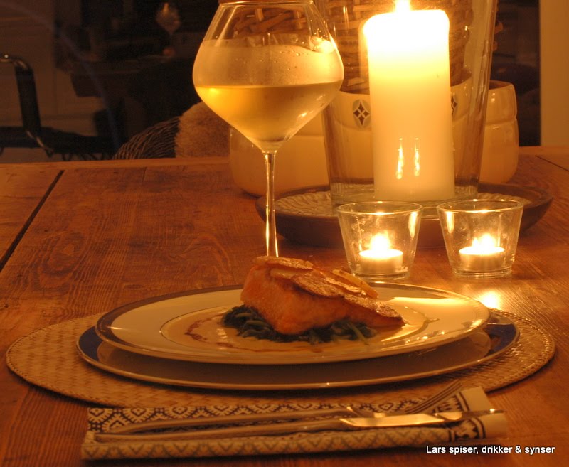 Vinen vi drakk til denne retten var en hvit bourgogne, Saint-Bris sauvignon 2008. En ung og frisk vin med dog med karakteristisk borgoder smak. Middels dyp grønngul farge. Ung fruktighet preget av stikkelsbær, sitrus og asparges over toner av mineraler. Frisk. Link til vinen på Vinmonopolets sider