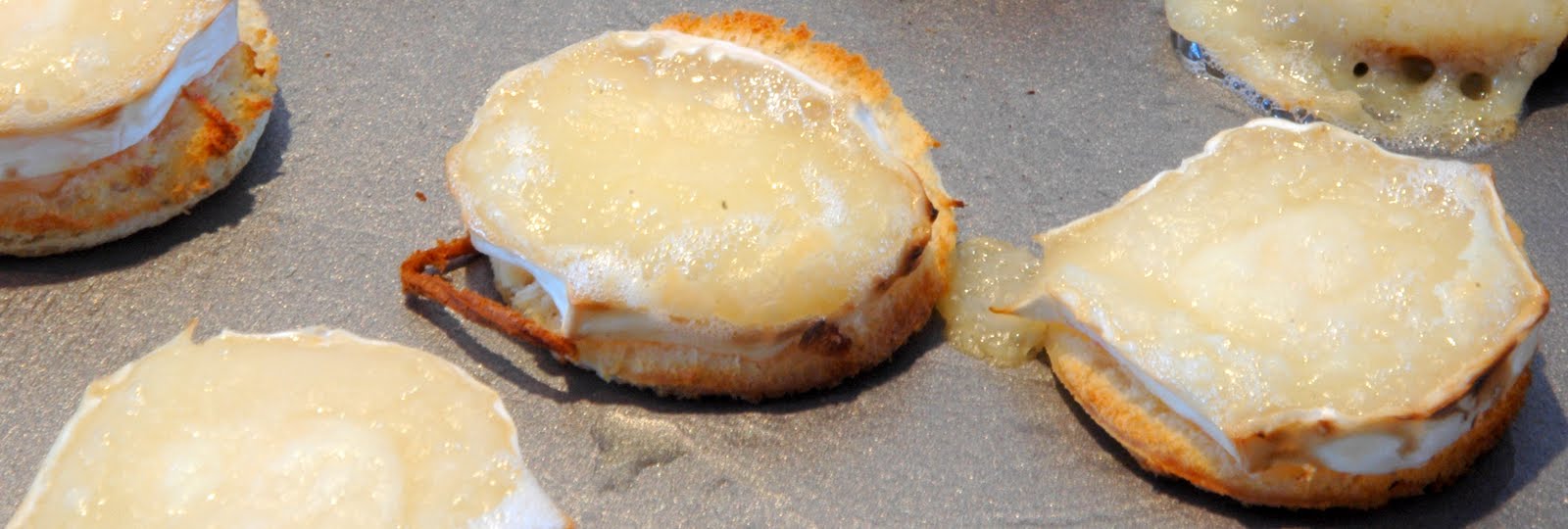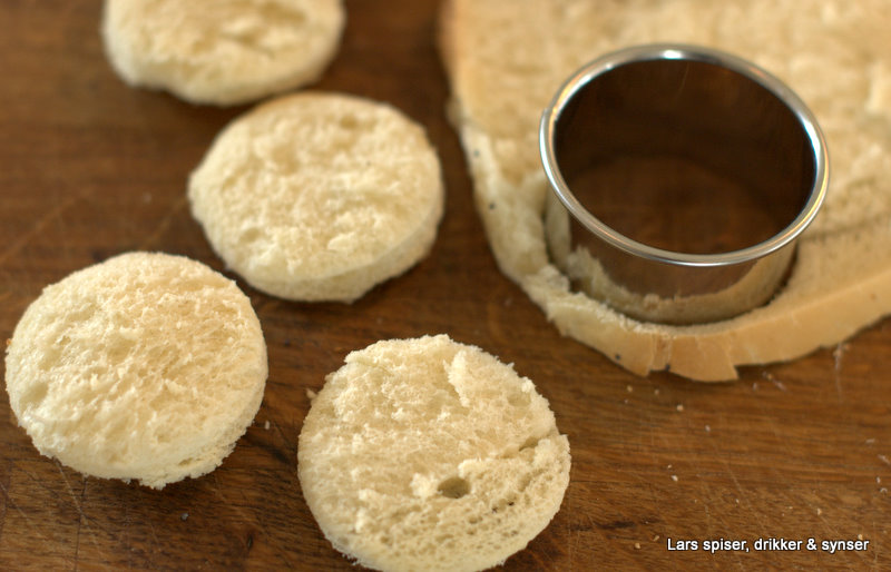 Chevré-toast. Jeg skar 1 cm tykke loffeskiver og stanset ut rundinger som var tilnærmet omkretsen på chevrén jeg hadde. Kutt chevrén i skiver og plasser på loff bitene.