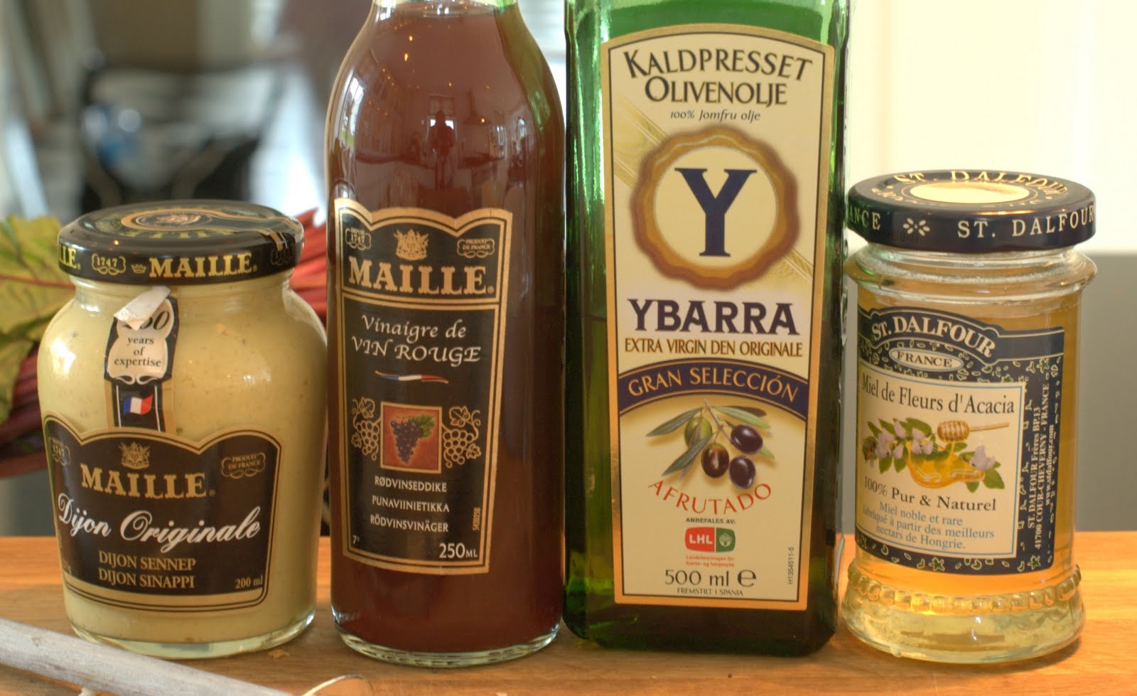 Start med vinaigretten. Fint at vinaigretten får stå og sette seg litt mens du tilbereder resten. Bland 3 ss god olivenolje, 1 ss rødvinseddik og 2 ts Dijon sennep. Pisk dette sammen med en gaffel og smak til med salt og sort pepper.