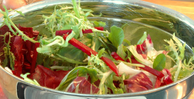 Salat – feldsalat, radicchio rosso og frisée. Jeg liker særlig godt bitterheten fra radicchio rosso`n opp mot sødmen i honningen og den fete osten i denne salaten. Vask og tørk salaten godt. Riv salaten i rause biter å ha den i en stor bolle.