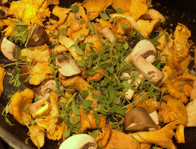 Sauter sopp og timian i olivenolje og smør. La dette hvile i panna til risottoen har kokt klar.