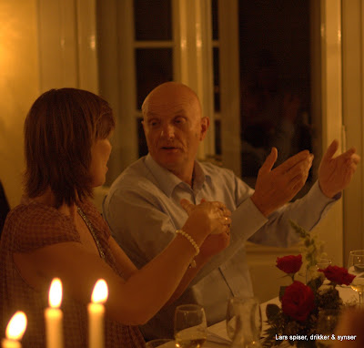 Etter å ha hilst på fiffen i byen – som besto av en mengde hyggelige folk, ble vi geleidet opp i spisesalen. Det var dekket til 70 og vi var 70. Friske blomster, kandelabre og hvite duker – fint.