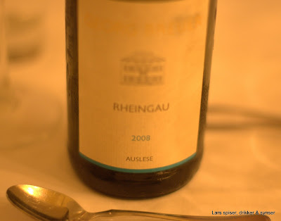 Så var det tid for første rett og første vin. Vinen var en Riesling Rauenthal Estate Riesling 2008, Lys grønngul. Ung fruktighet preget av lime og grønt eple, innslag av mineraler, furunål og nøtt – fint duft med hint av petroleum. Noe som overrasket i en så ung vin. Denne vinen skulle vise seg å bli Fruens favoritt denne kvelden. Den koster ca 170 kroner på vinmonopolet.