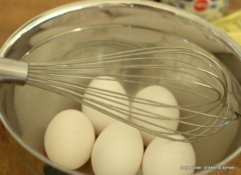 Mens smøret smelter pisker jeg 5-6 egg i en bolle. Jeg bruker alltid ballongvispen min til dette. Foodprosessor er for pingler når man skal lage pannekaker – dessuten er denne fysiske aktiviteten en fin motvekt til alle kaloriene jeg ender opp med å dytte i meg.