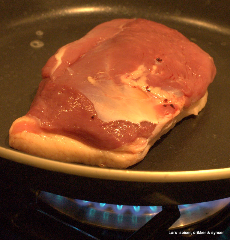 1 andebryst – rut opp fettet på andebrystet som om det var en mini-ribbe. Jeg bruker skalpel. Dette gjør at du får en sprø, fin svor på kjøttet. Salt og pepre brystet. Legg brystet i kald panne og sett gassen på full styrke. Da smelter fettet fint og det som sitter igjen på brystet blir sprøtt. Stek med fettsiden ned i 4-5 minutter. Snu brystet og stek det ferdig på middels varme – ca 5 minutter. Legg brystet til hviling på kjøkkenbenken mens du gjør resten klart.