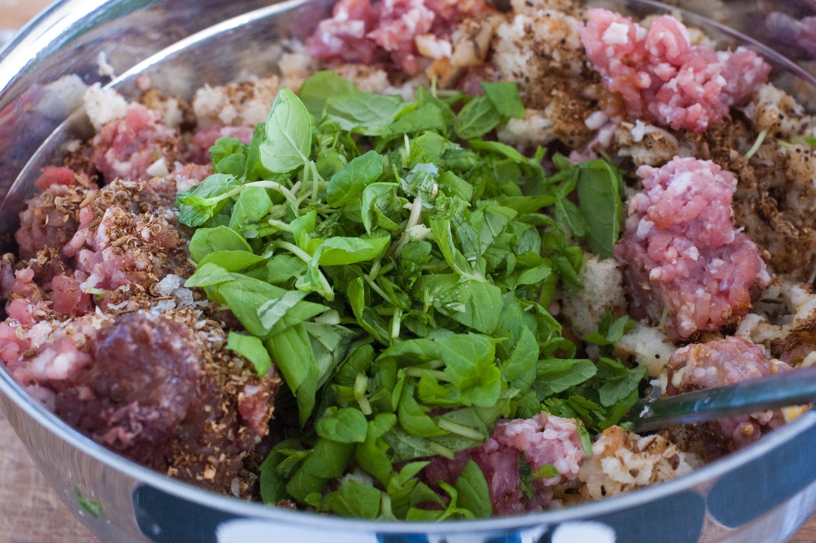 Ha kjøttdeigen i en stor bolle, bland inn 4ss brødrasp, 2-3 hvitløksfedd, saften av en sitron, 1 egg, en raus neve finhakket mynte, halvparten av de ristede krydderiene, salt & pepper. Bland dette godt sammen. Form kjøttbollene i håndbaken med en skje og stek kjøttbollene i solsikkeolje. Hold dem varme.