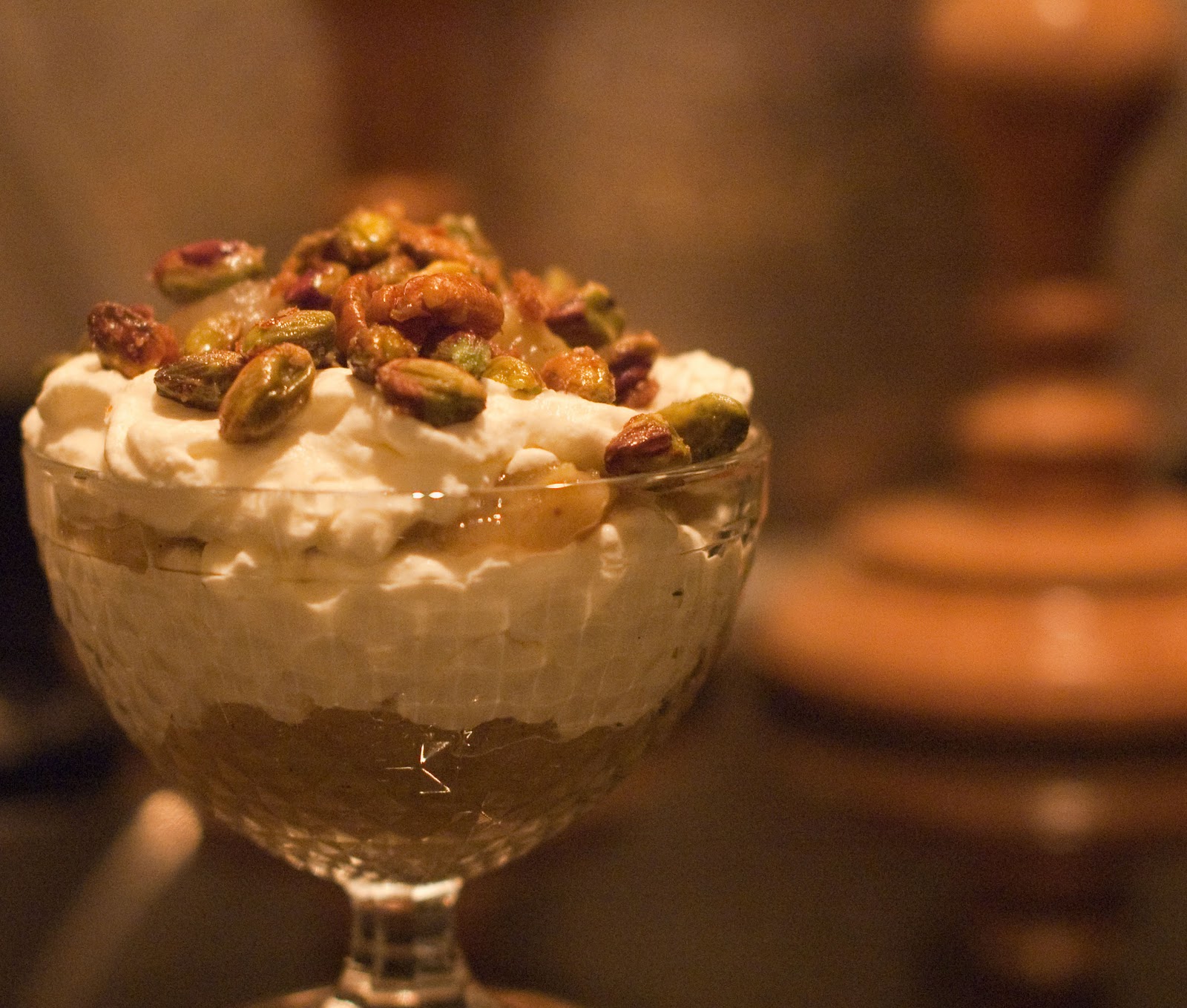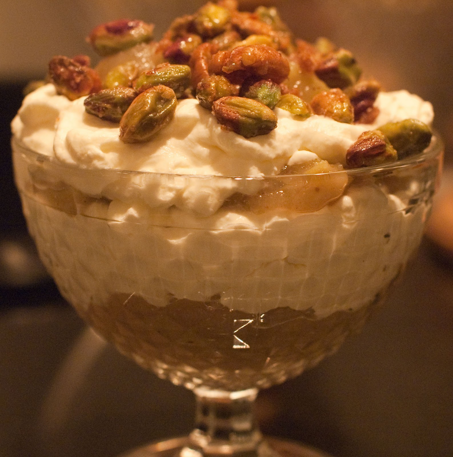 Anrett eplemos, stekt brødrasp og krem lagvis i porsjonsglass eller i en glassbolle.Dryss over raust med de karameliserte nøttene. SPIS!