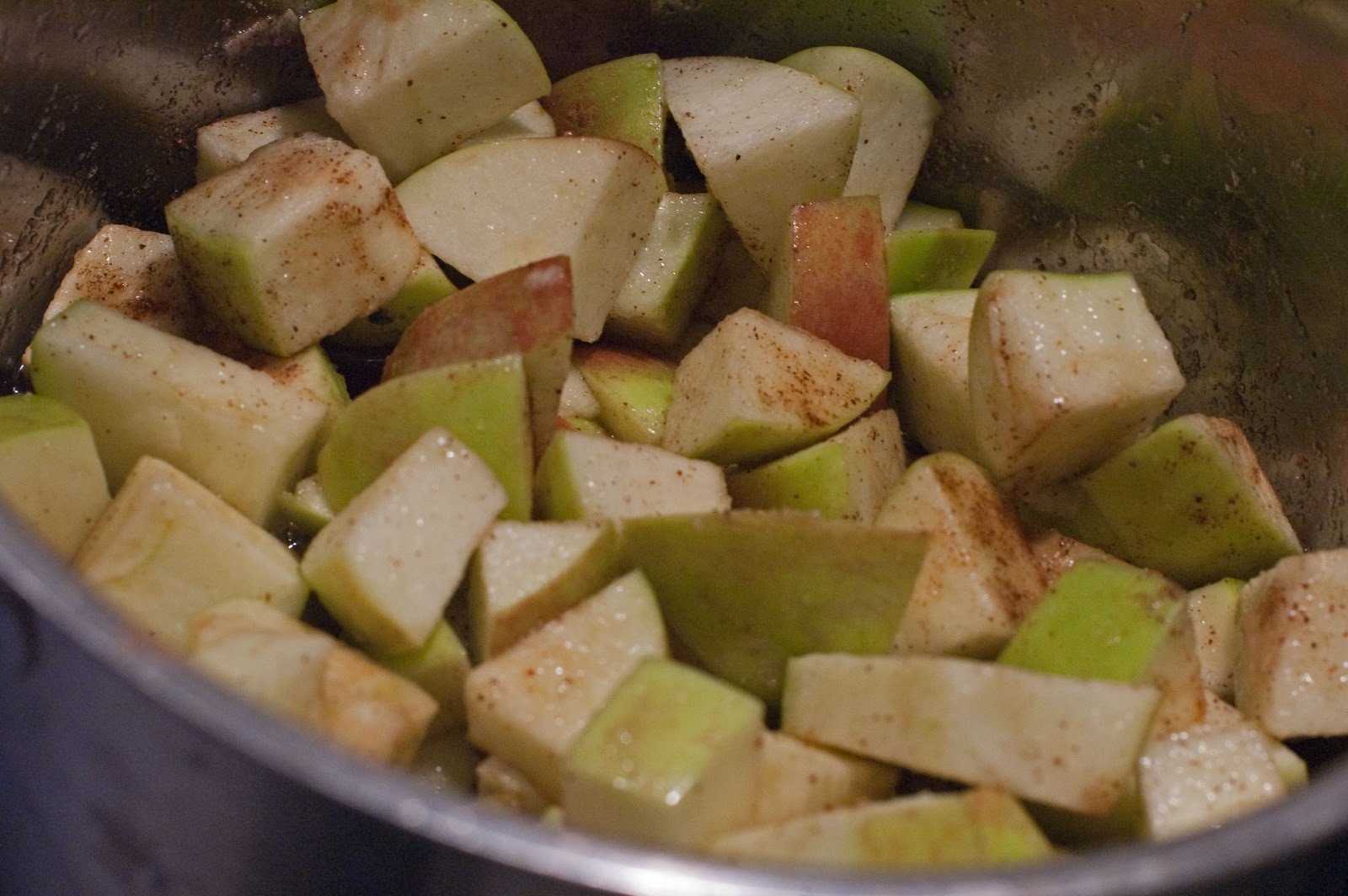 Kutt 6-7 epler i grove biter. Har eplene veldig tykt skall kan du skrelle dem, men jeg foretrekker at skallet er på – det gir retten en rustikk følelse. Ha eplene i en kjele sammen med en vaniljestang (evt. 1 ts vaniljesukker), 1 ts kanel, 1 dl sukker og 1,5 dl vann. Kok opp og la det putre til eplene er helt møre og du har en marmelade. Etterfyll med litt vann om marmeladen er for tykk. Sett eple-marmeladen kaldt til du skal montere desserten.
