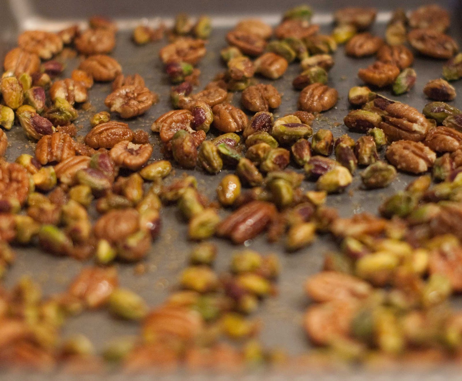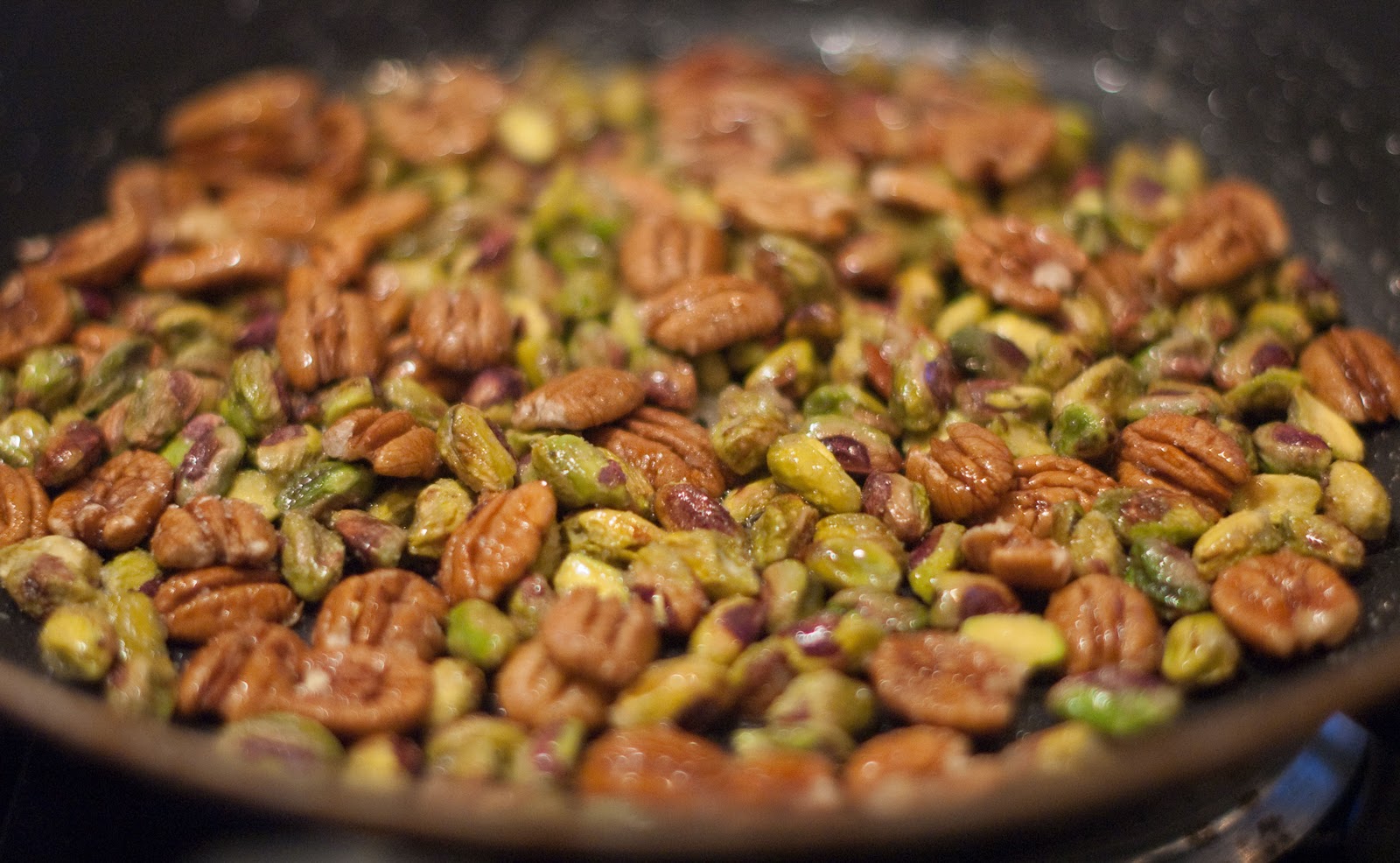 Det vanligste i tilslørte bondepiker er å bruke brødrasp. En av gjestene våre denne kvelden har cøliaki derfor valgte jeg å karamelisere nøtter – pecan & pistasj. Bruk en varm panne, usaltet smør og noen klyper sukker. sørg for at det er bevegelse på panna hele tiden. Du ønsker ikke svidde nøtter, men karameliserte – så følg med. Når nøttene er klare har du dem over på et bakebrett.