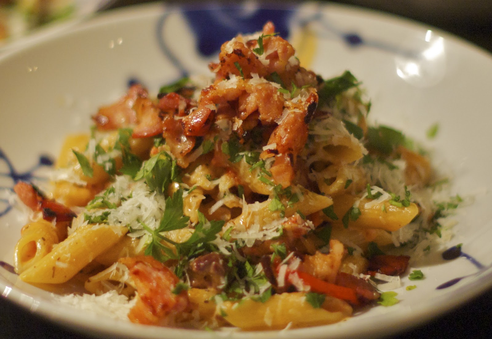 Legg pasta`n opp på varme tallerkener, ha over bacon/paprika og strø på mer parmesan og bladpersille – SPIS