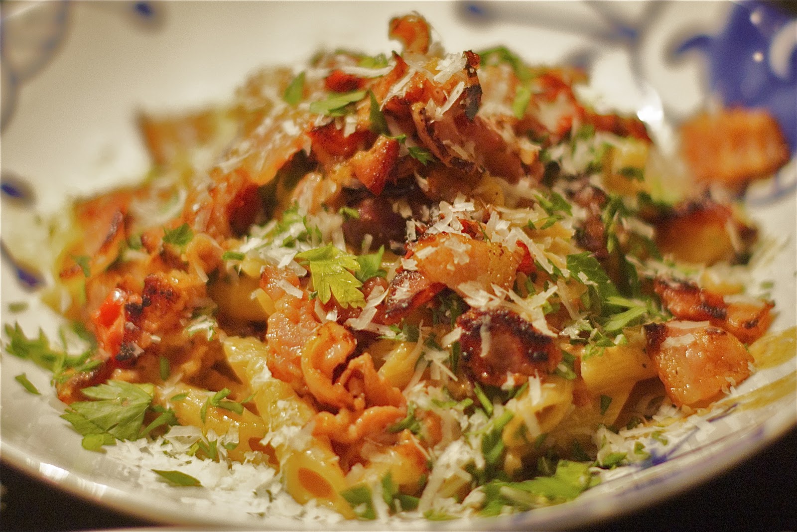 Bland penne`n sammen med sausen. Rør godt – du vil at sausen skal komme inn i pasta-rørene. Ha i en raus neve med parmesan og finhakket bladpersille (de 2 siste ingrediensene hadde jeg i kjøleskapet – juksa litt)