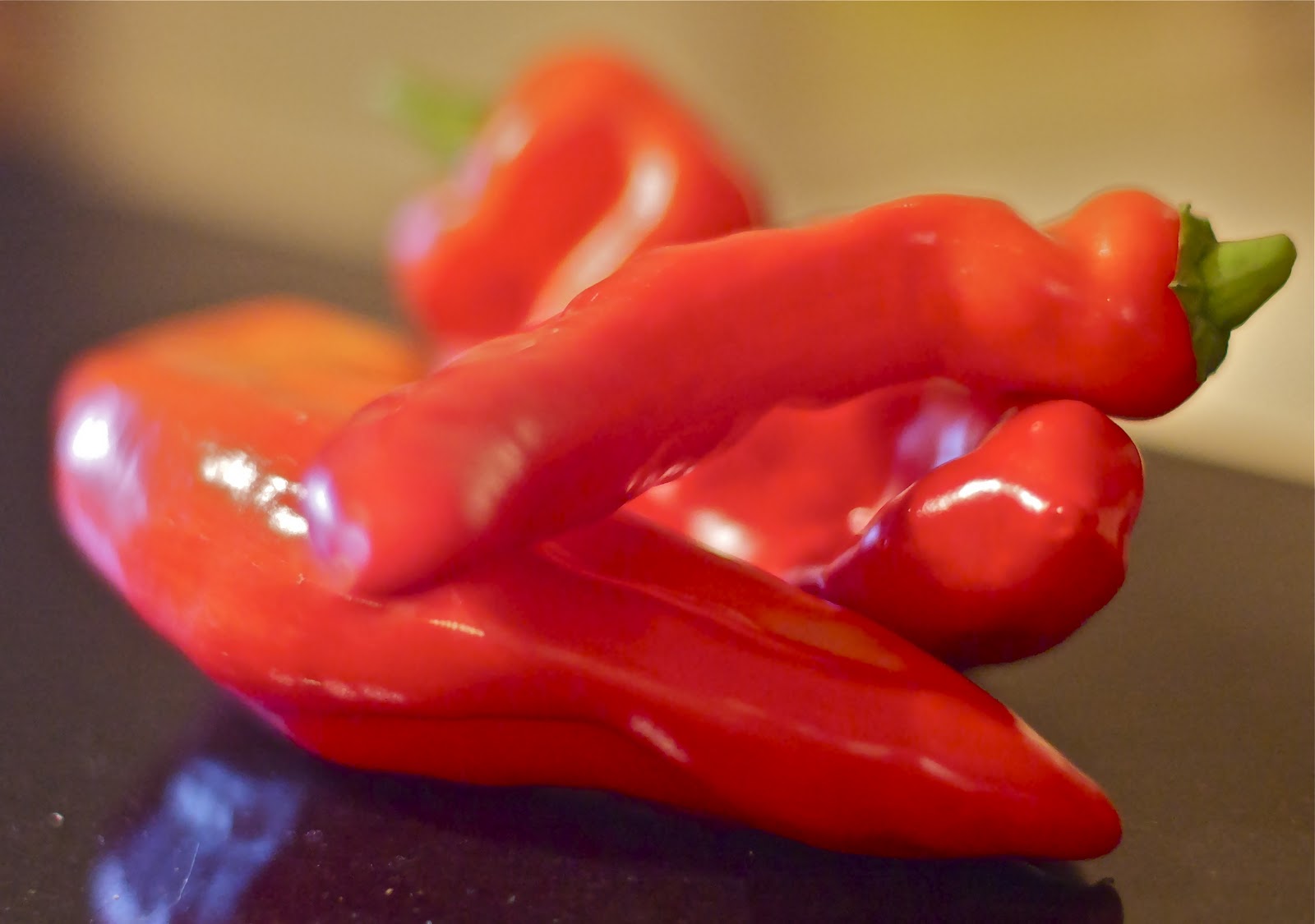 Stek så mye bacon du får tak i på benser`n, jeg fikk tak i 300 gram – noe som er latterlig mye for 2 posjoner, men Fruen virket desperat. Stek baconet sprøt. Ha i en finsnittet søt-paprika sammen med paprikaen.