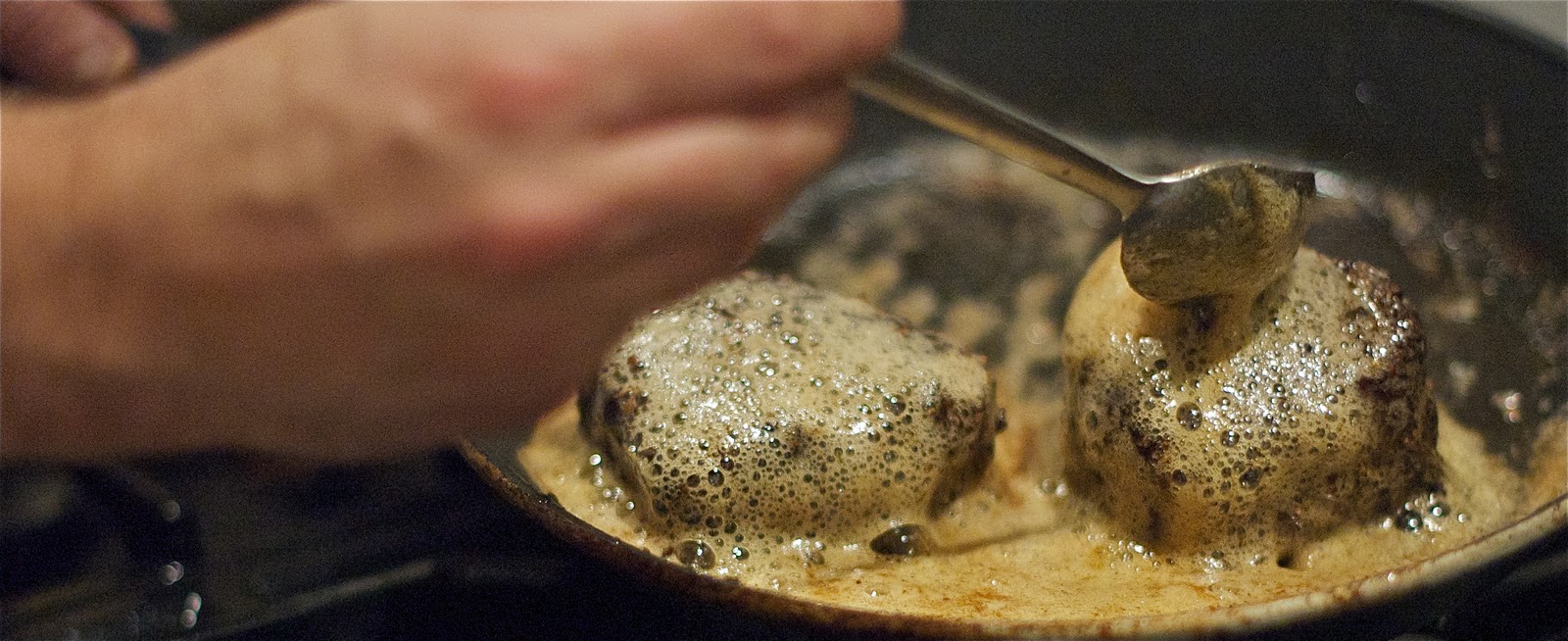 Varm pannen godt, ha i 1 raus ss usaltet smør og 2 ss olje. Stek biffene på alle sider for å gi en stekeskorpe. Ha så biffene i et ildfast fat, inn i ovnen på 180 grader i 5-6 minutter. Så lar du kjøttet hvile mens du styrer inn tilbehøret (10-15 minutter). Når alt er klart har du biffene tilbake i panna sammen med 2-3 ss usaltet smør. Stek biffene hurtig på alle sider mens du hele tiden øser over smøret.