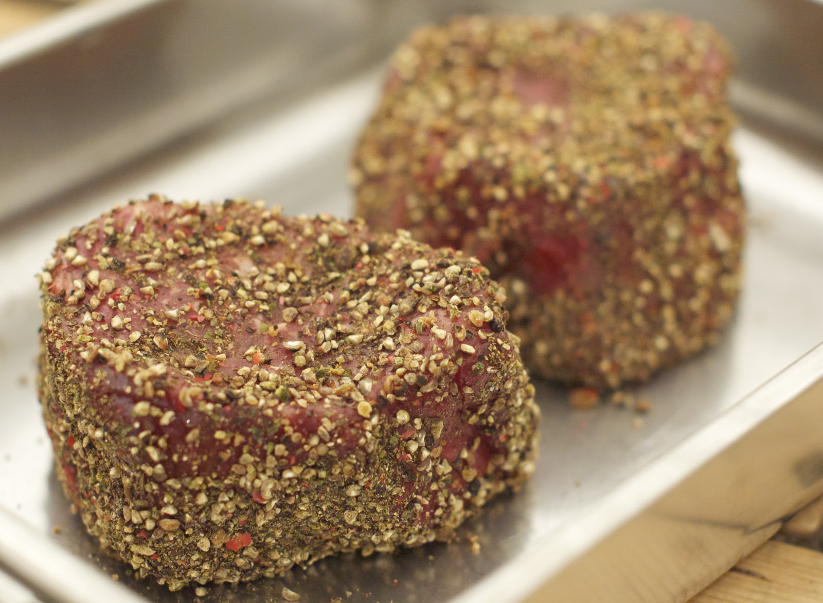 Knus 3-4 ss pepper (rød, sort, hvitt & grønt) i en morter. Rull biffene i peppermiksen til de er helt dekt. Dette kan virke som galskap, men tro meg, sammen med løksausen og riktig vin vil dette ikke oppleves som heten i helvetes forgård.