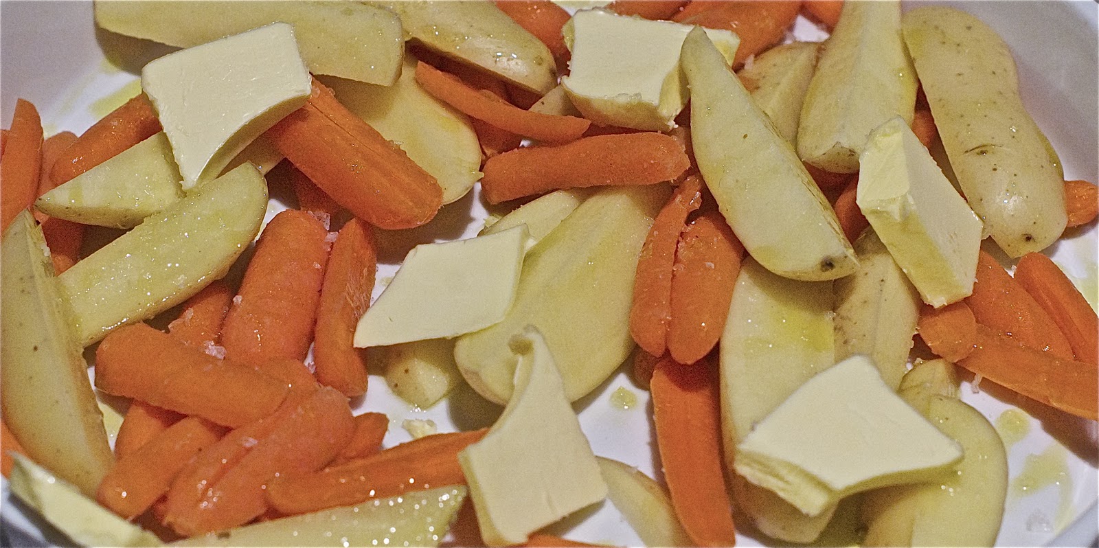 Til dette serverte jeg ovnstekte amadiepoteter  & gullerøtter og smørdampede mini asparges.
