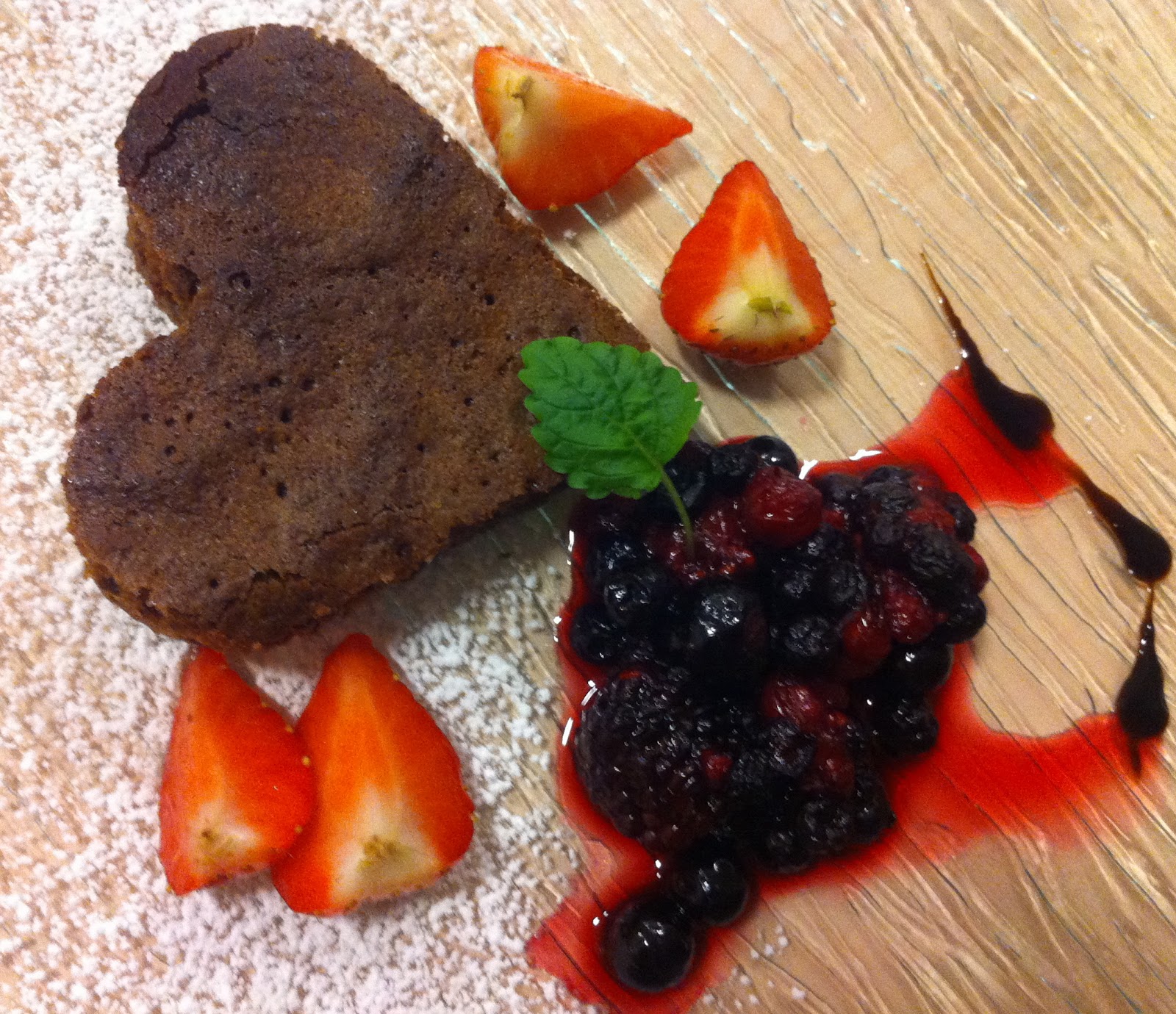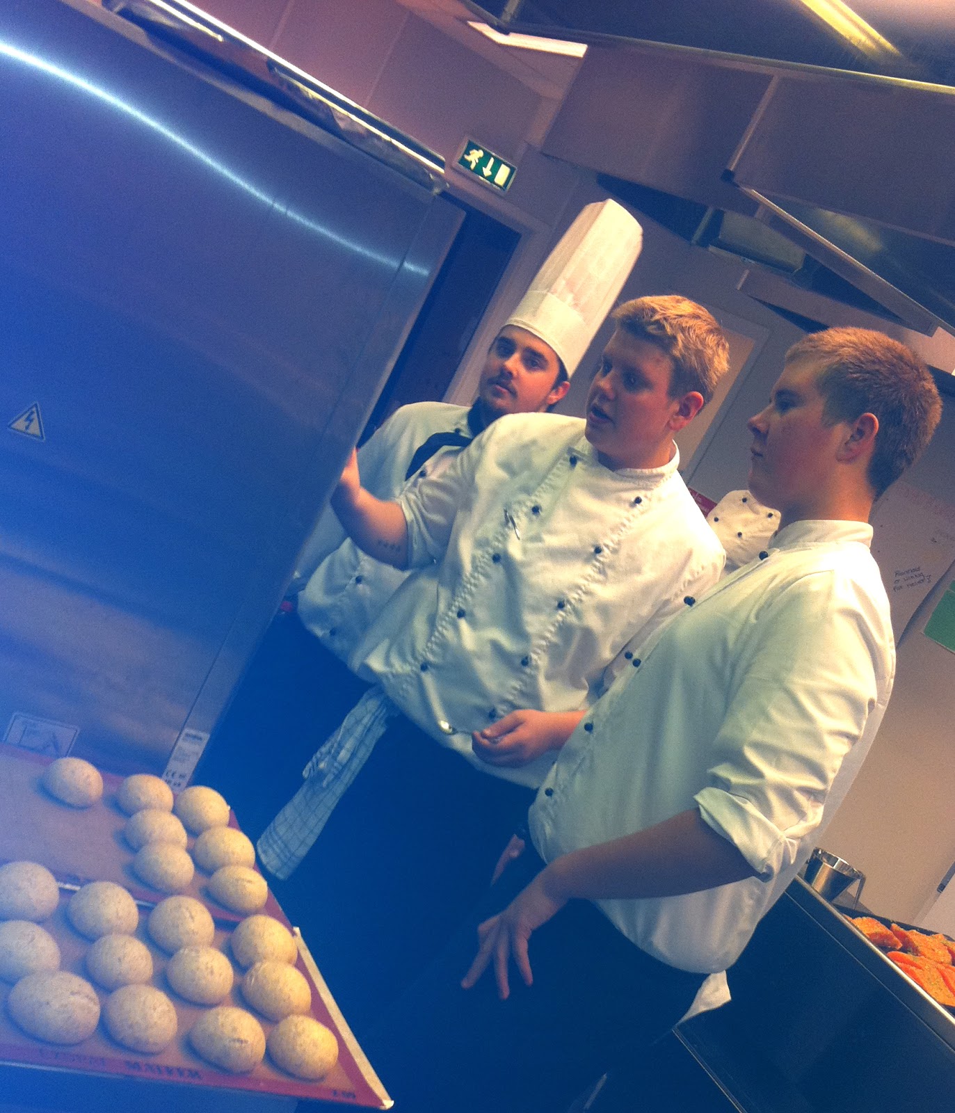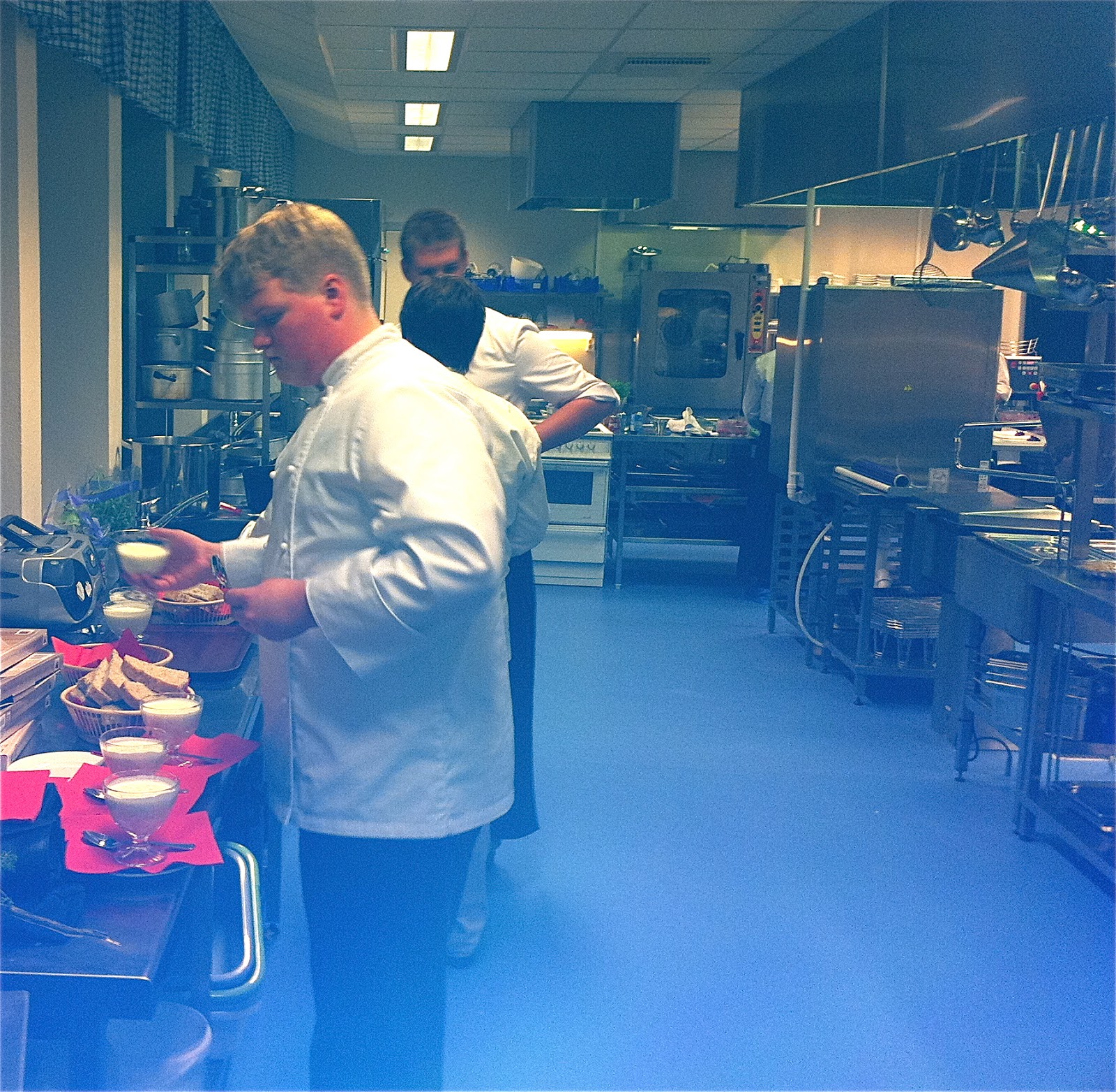 Etter reise og lydprøver ble vi geleidet over fra hallen til den lokale videregående skolen. Her hadde kokke- og servitør elevene laget i stand en 3-retters meny for oss. Menyen var Indisk karrysuppe, pestomarinert laks med hasselbackpoteter og cheesecake-brownies med friske bær. Maten var god, men det var først og fremst engasjementet og stoltheten til disse unge «kokkene» som var rørende og fint å oppleve.