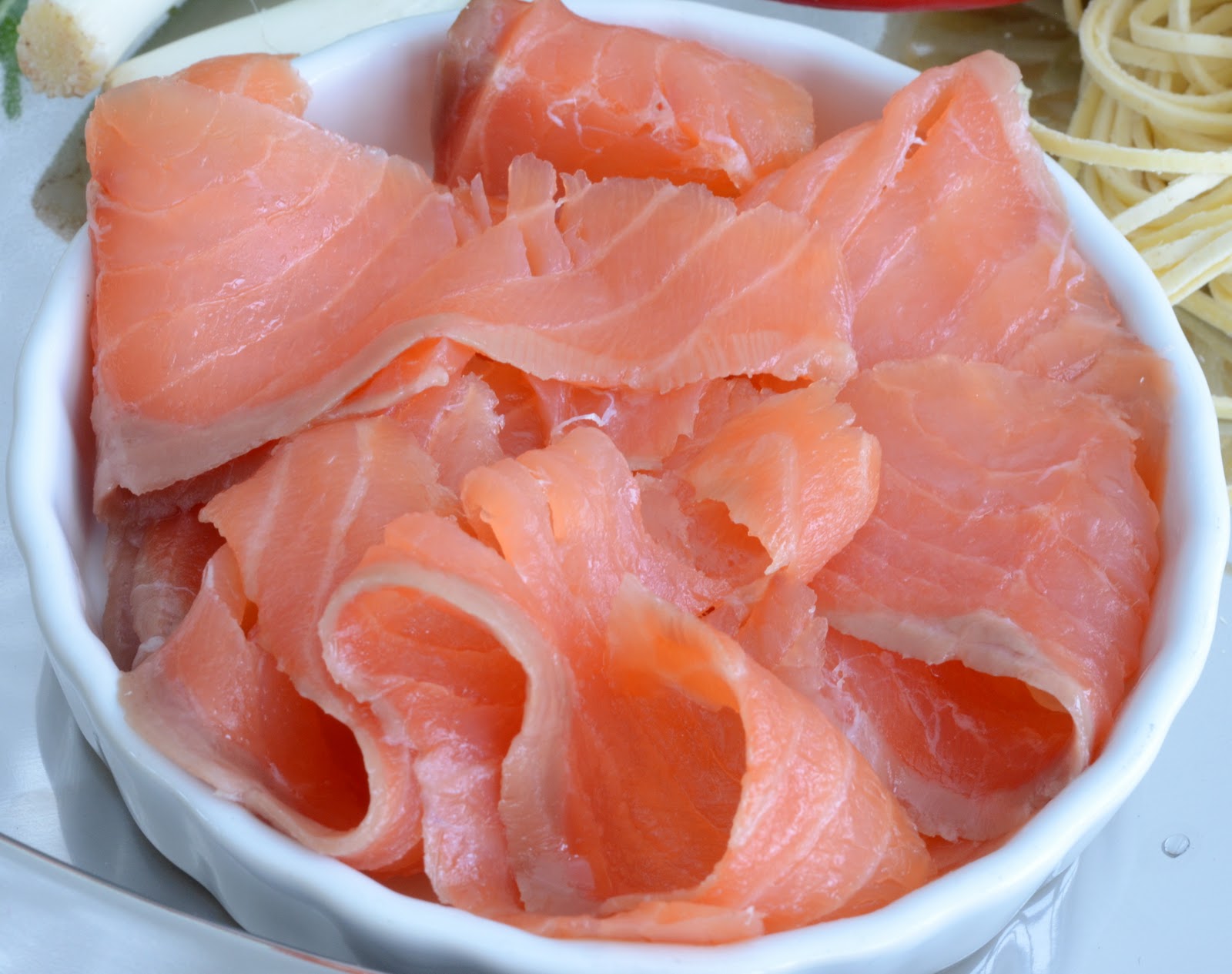 Når løken er myk heller du på 2 dl matfløte, lar det koke opp og holder det varmt til spagettien er ferdig kokt. Rett før servering har du i biter av røkelaks (ca 120 gram) og noen revne blader basilikum. Smak til med salt, pepper og sitronsaft.