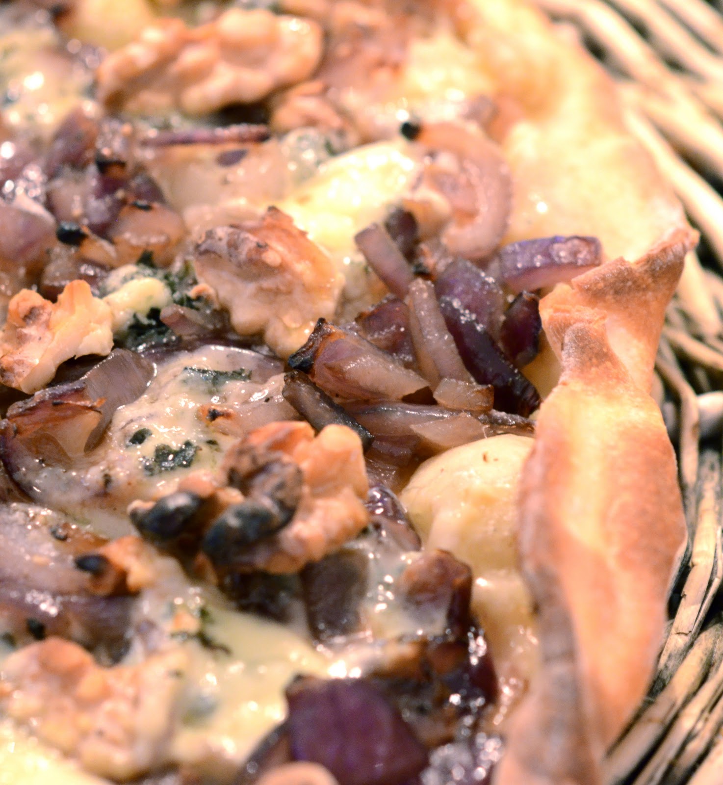 Fordel løken på pizzadeigen, dryss over en raus neve med valnøtter, og spre 150-200 gram Gorgonzola (blåmuggost) over det hele.