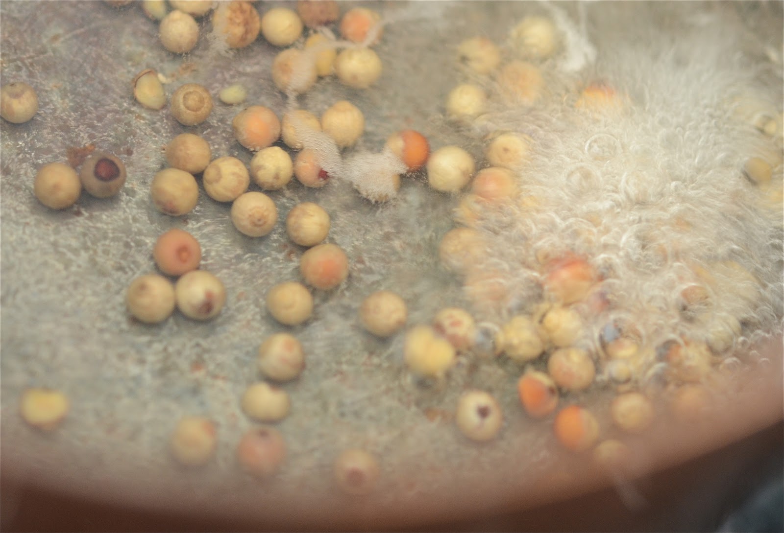 Sil av pepperet, og ha væsken tilbake i gryta litt stor stål bolle. Smelt smøret og la det kjøle seg litt på benken. Ha en stor gryte med kokende vann på plata, sett stål-bollen med egg, vin, vann og pepper opp i den store gryta. Ha i 4 eggeblommer opp i væsken og PISK! Viktig at dette ikke koker, men kun får varme fra det kokende vannbadet i gryta under. Mens du pisker sper du i det smeltede smøret, litt av gangen. Trikset nå er å piske til du ser mannen med ljåen og litt til. Sakte men sikkert vil du se at blandingen nærmer seg perfekt saus-konsistens.