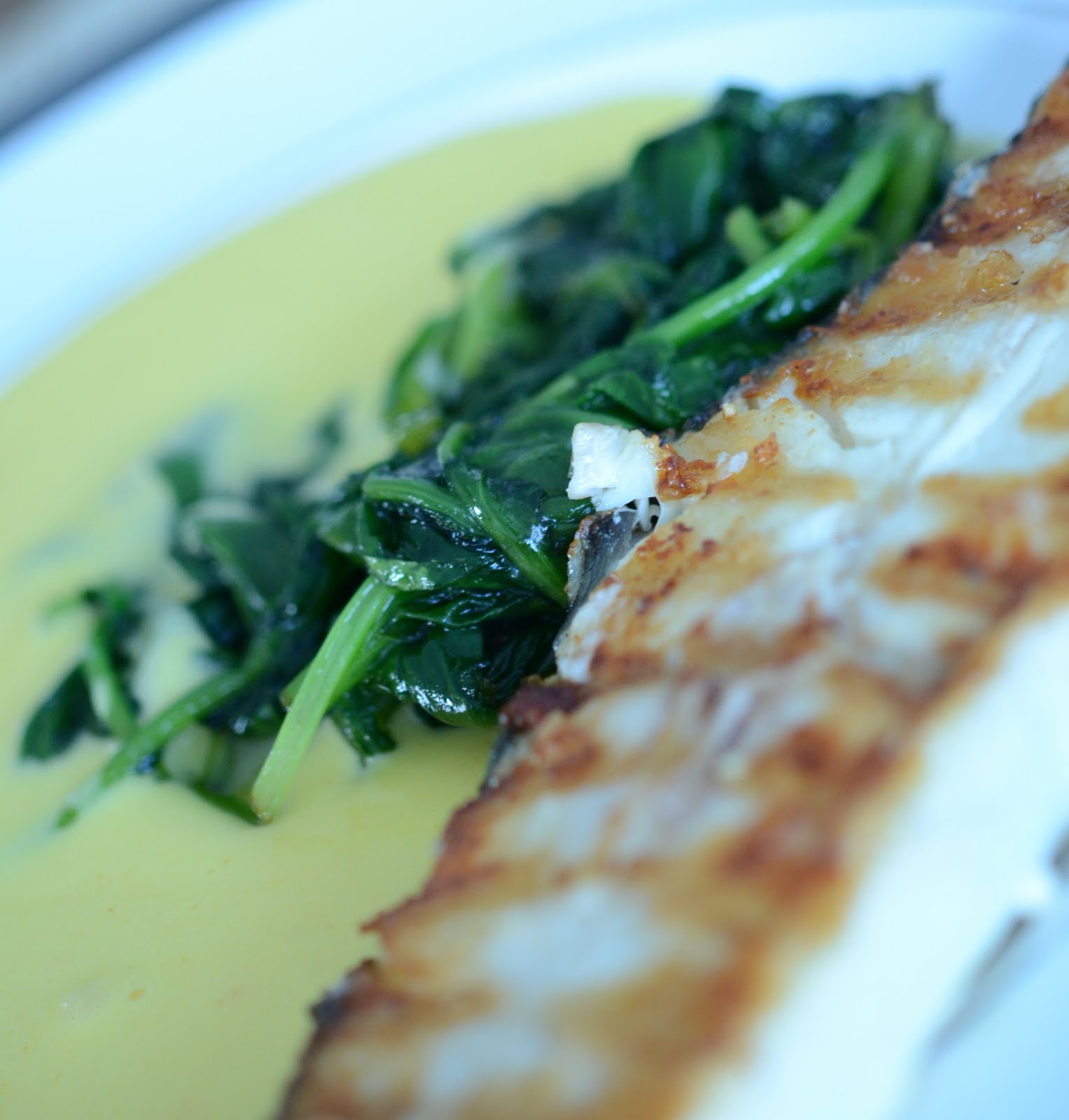 Ha den smørdampede spinaten på varme tallerkener, legg på den grillede fisken og øs på med hollandaise`n – SPIS!