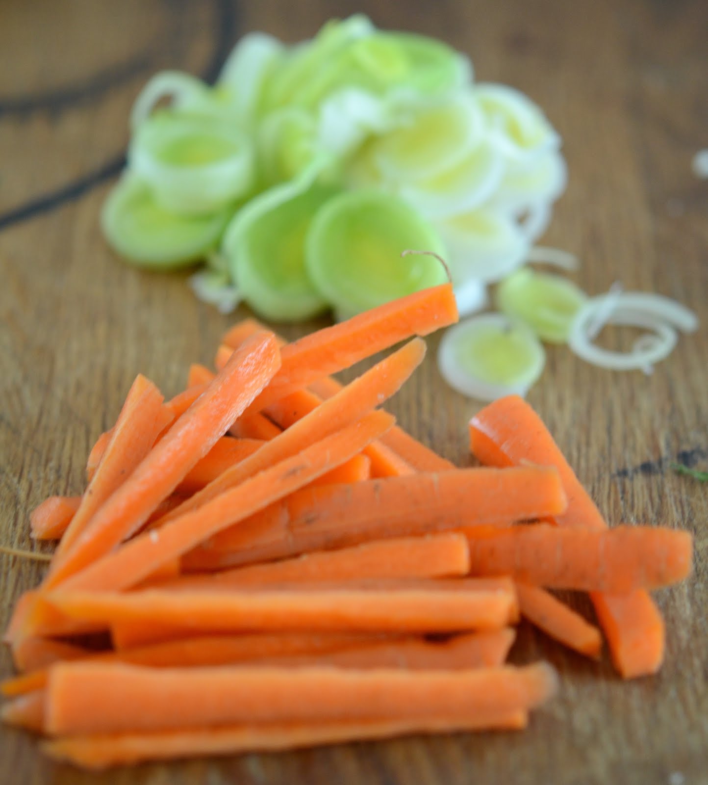 Kutt 3 gulrøtter i små staver og snitt en purre i skiver.