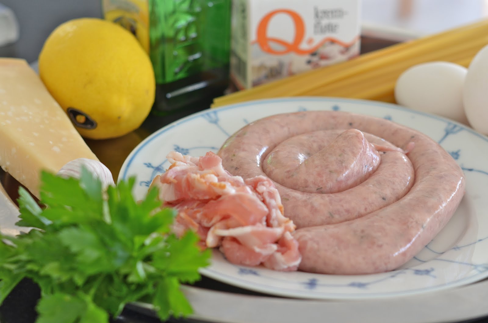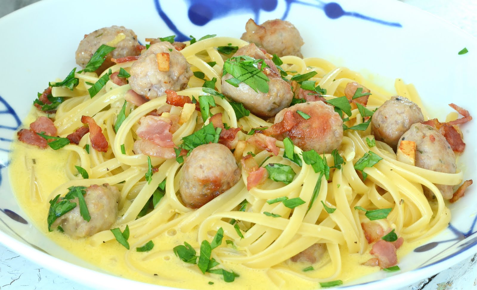 Når pastaen er ferdig kokt heller du av vannet og har pastaen tilbake i gryta sammen med ”eggestanden” rør rundt og la pastaen suge til seg sausen. Nå vil eggeplommene bli tiberedt av varmen fra pastaen og fløten vil smøre det hele til en silkemyk herlighet. Blir det litt tørt har du i en ss varmt vann. Bland inn kjøttbollene og baconet.