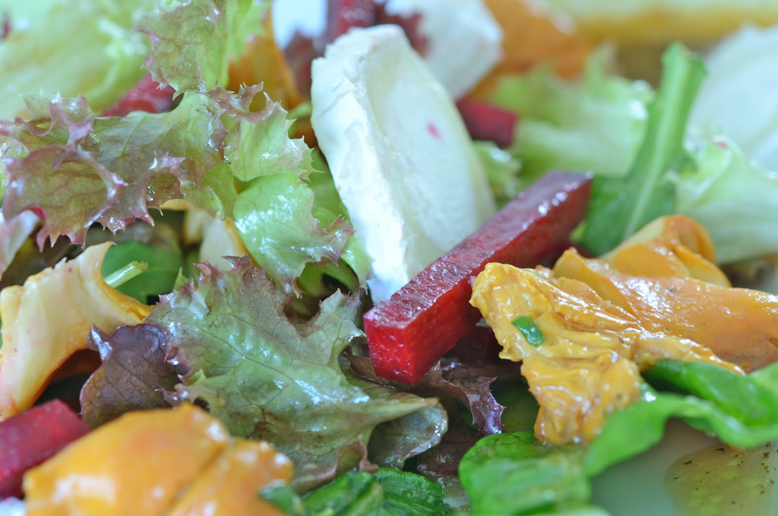 Vend inn vinaigretten og legg opp salaten på store kalde tallerkener. Ha over skiver av chevré, små staver av 3 ferske rødbeter (som er o på sitt beste akkurat nå), skiver av kyllingfileten og server med noen tynne skiver baguette stekt i olivenolje – SPIS!