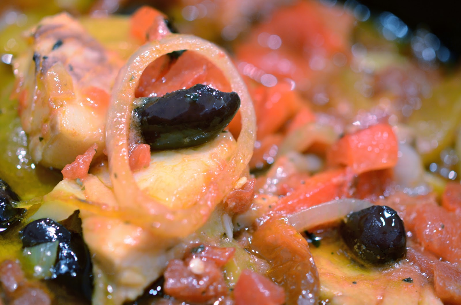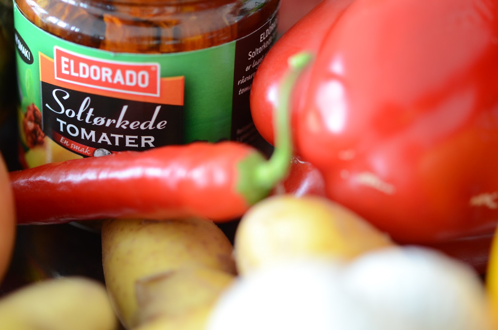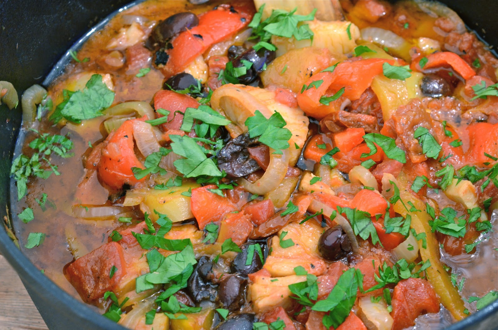 Så har du i 100 gram hakkede soltørkede tomater, 2 bokser med gode hermetiske tomater, 2 finhakkede røde chili (la frøene være med om du vil ha den het som jeg), 2 laubærblad, paprikaene, en neve gode sorte oliven og fiskebitene.